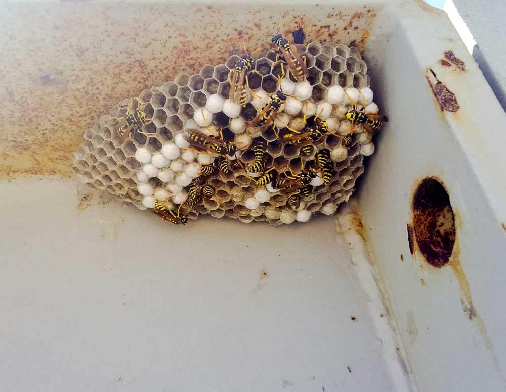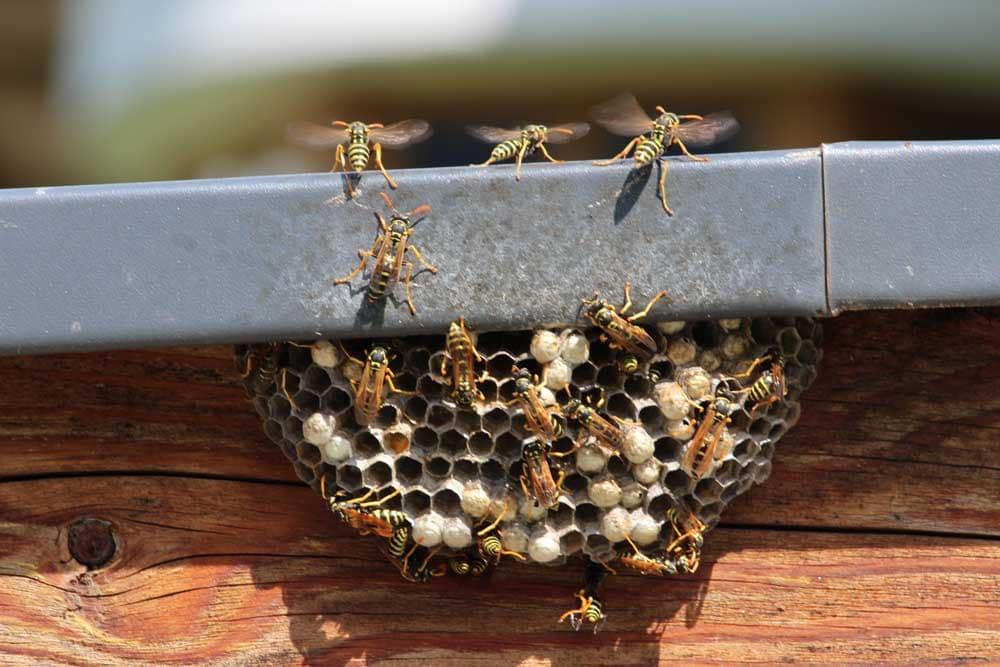 Wasps create nests made of a paper-like material, filled with small holes in which they lay their eggs. They build nests anywhere that is hot and protected from the elements, such as roof overhangs, gutters, picnic tables, and sheds. Metal swing sets and playground equipment are favorite hangouts for wasps because of the small holes that allow them to enter and exit easily. Wasps are also attracted to areas with water, sugary foods and drinks, uncovered garbage cans, or smaller insects to prey upon. Wasps become fiercely aggressive when threatened by someone approaching their nest.